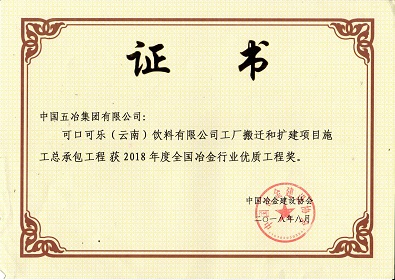 可口可樂(云南)飲料有限公司工廠搬遷和擴建項目施工總承包安裝工程-2018年度全國冶金行業優質工程獎