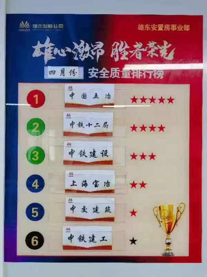 此項排名由雄安集團城市發展投資有限公司發起,以月度為周期,從安全質量等五大維度對6家參與雄東B單元安置房項目建設的央企總包單位進行綜合考核。中國五冶集團憑借優秀的項目管理能力和安全質量水平,自2月份以來已連續3次榮膺履約考評第一佳績,項目4名管理人員連續2次摘得“安全質量之星”“項目管理之星”榮譽稱號。