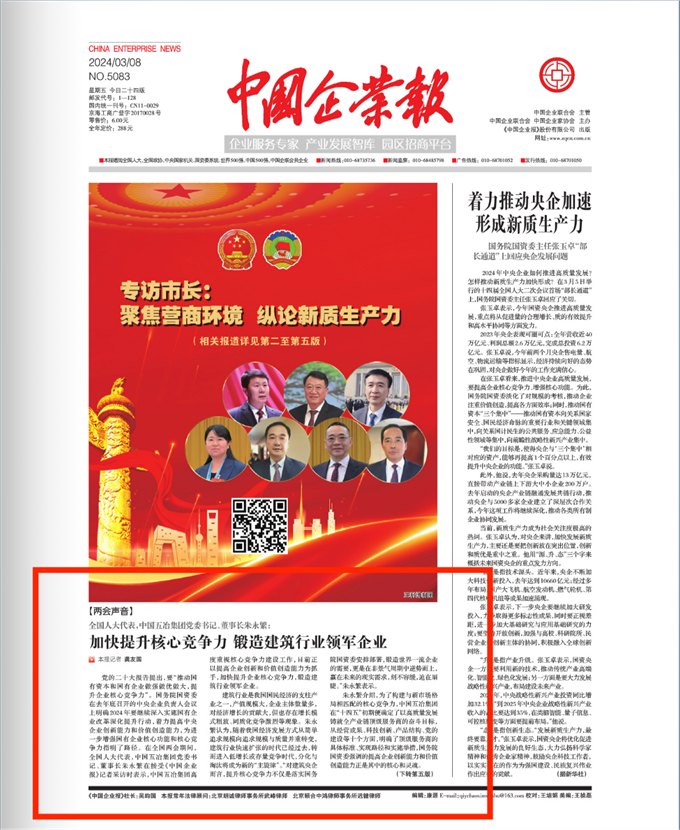 2024年全國兩會期間,全國人大代表,中國五冶集團黨委書記、董事長朱永繁接受多家權威主流媒體專訪,積極履職建言獻策,實事求是講述五冶高質量發展情況。3月8日,《中國企業報》頭版以《加快提升核心競爭力 鍛造建筑行業領軍企業》為題刊發對朱永繁代表的專訪報道,現對報道進行全文轉發。